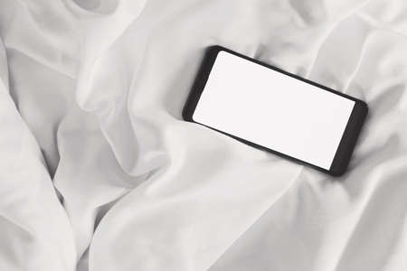 Blank screen mobile phone on the wrinkle white bed sheet.