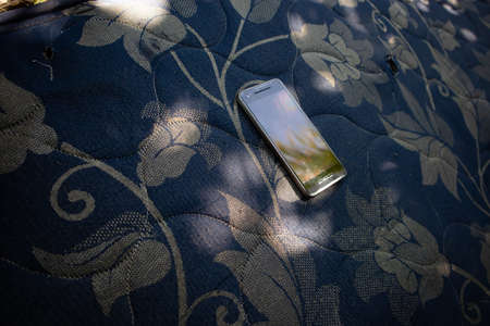 cellphone on an unused foam mattress outside the room