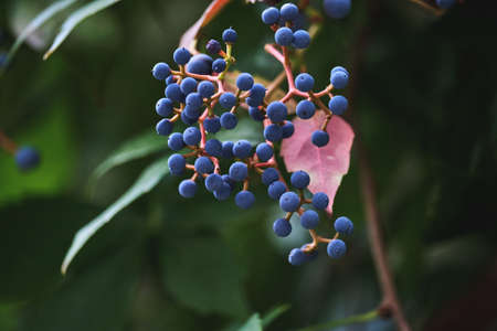 Parthenocissus quinquefolia, five-leaved ivy woodbine dark blue berries close up