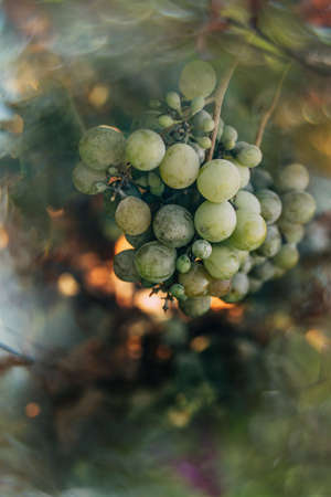 beautiful ripe green grapes on a vine in a vineyard on a warm autumn day in close-up