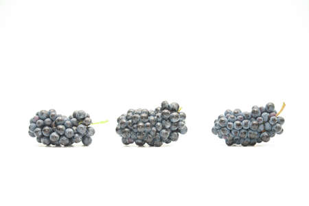 Three isolated bunches of dark wine grape variety lying on its side on a white background