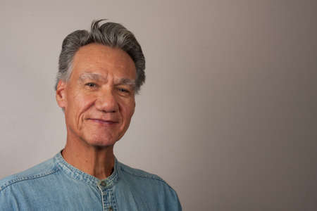 Heads shot Portrait of a mature man 60 plus wearing a Light blue denim shirt