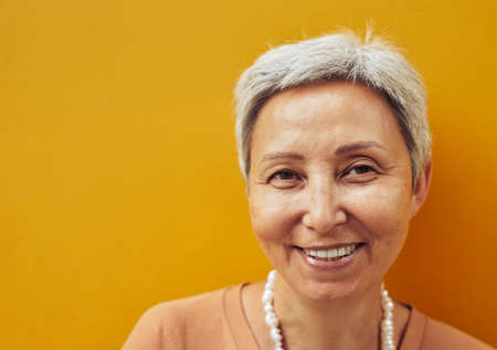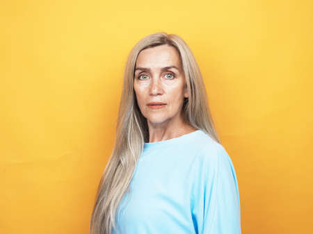 Close up portrait of confident mature woman posing against yellow background and looking at camera, copy space