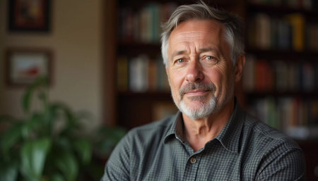 A mature man with gray hair, resident of USA, smiles gently. The warm lighting creates a cozy atmosphere. Calm, confident look. Experience, professionalism and intelligence in the eyes. Generative AI.
