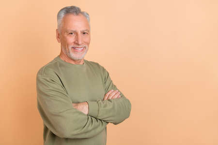 Profile side photo of mature man crossed hands intelligent promoter banker isolated over beige color background