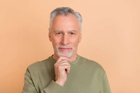 Photo of aged man hand touch chin concentrated thoughtful minded isolated over beige color background