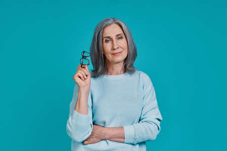 Pretty senior woman in eyeglasses looking confident and positive