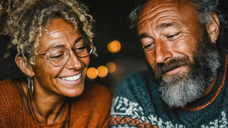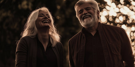 Joyful Senior Couple Laughing Together Outdoors at Golden Hour.