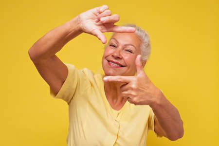 Senior woman looking at camera and gesturing finger frame