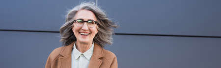 Cheerful grey haired businesswoman in coat and eyeglasses smiling at camera outdoors, banner