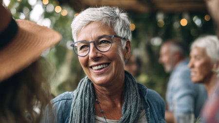 A smiling older woman with short gray hair engages in cheerful conversation with friends in a warm and inviting outdoor area. The scene captures a sense of community and connection.