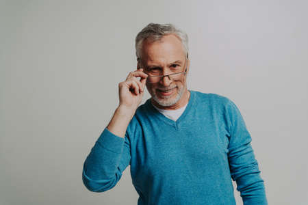 Close-up portarit of senior grey-haired man isolated over light blue background.