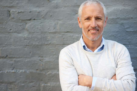 Thats one confident smile. Portrait of a mature businessman standing with his arms folded against a brick wall.