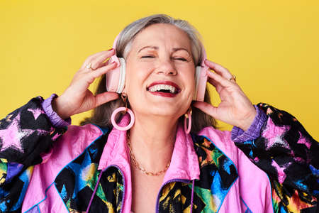 Let the music take you away. Cropped shot of a cheerful and stylish senior woman listening to music on headphones against a yellow background.