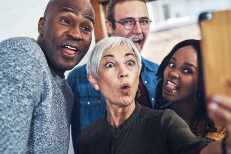 Pull a silly face. a group of cheerful businesspeople taking a self portrait together with a cellphone inside of the office.