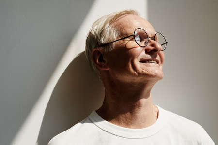 Minimal portrait of smiling senior man lit by sunlight against white wall and smiling, copy space