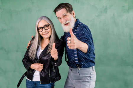Lovely senior smiling joyful couple, handsome bearded man and pretty gray haired woman, posing to camera in front of green wall and showing their thumbs up gesture