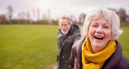 Portrait Of Loving Senior Couple Enjoying Autumn Or Winter Walk Through Park Together