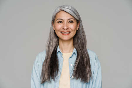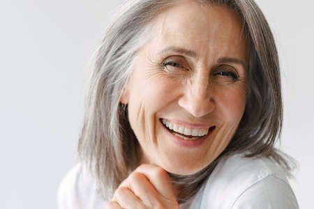 Mature white-haired woman smiling and looking at camera isolated over gray wall