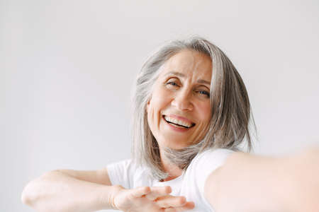 Grey senior woman laughing while reaching her hand to camera isolated over white background