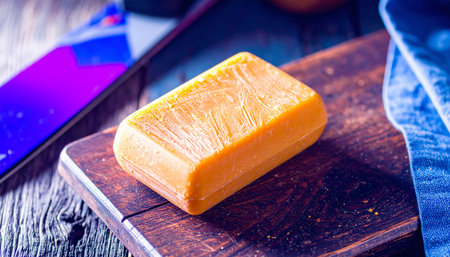Realistic macro close-up of textured yellow ski wax bar placed on rustic wooden table surface with soft natural side light, minimal alpine equipment concept, no humans, no text.