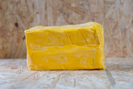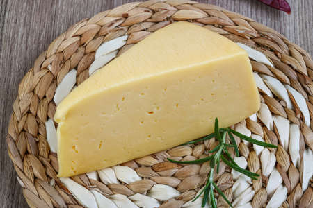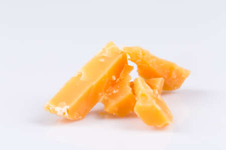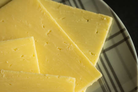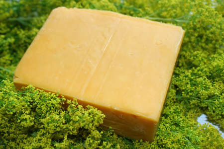 Piece of bright yellow hard cheese cheddar, originating in the English village of Cheddar in Somerset close up