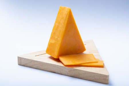 Piece of hard orange Cheddar cheese on wooden cheese plank isolated, close up