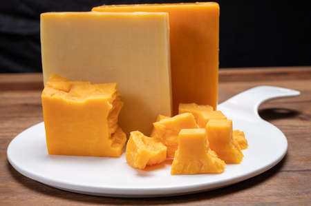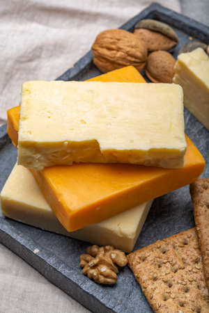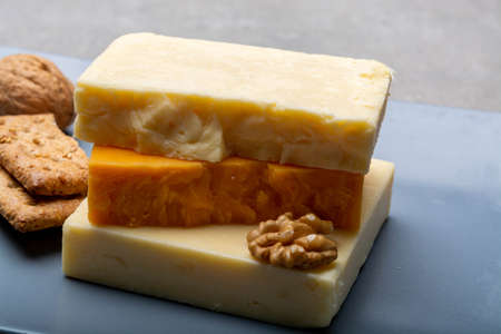 Cheese collection, matured and orange original British cheddar cheese in blocks served on grey plate close up