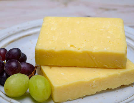 Piece of hard orange Cheddar cheese served with black grape, close up