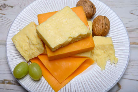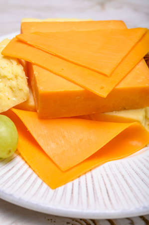 Cheese collection, orange and yellow smoked British cheese from England close up