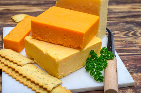 Cheese collection, matured and orange original British cheddar cheese in blocks served with crackers close up
