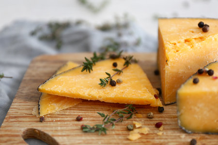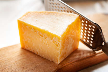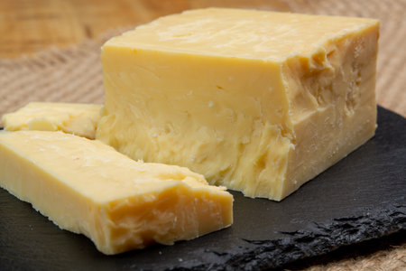 Cheese collection, piece of matured British yellow cheddar cheese made in Somerset from cow milk close up