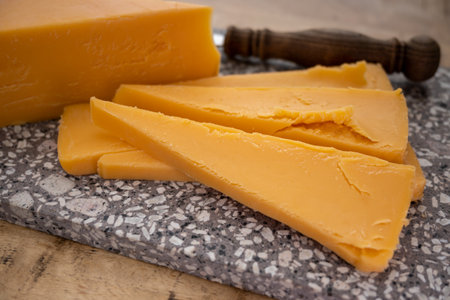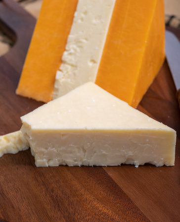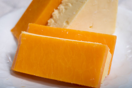 British cheeses collection, Scottish colored and English matured cheddar cheeses close up.