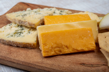 English cheeses collection, mature and colored cheddar cheese and semi-soft, crumbly old stilton blue cheese close up on plate