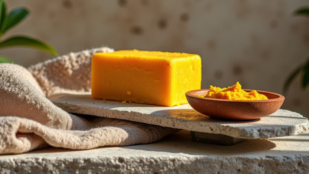 Natural organic turmeric soap and powder on rustic stone background. That the image is generated using AI.