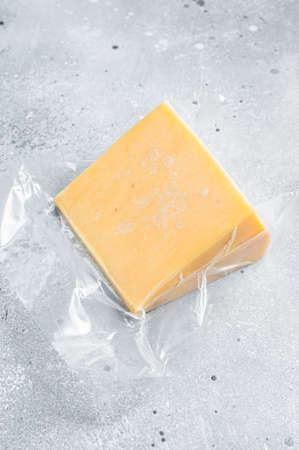 Organic Sharp Cheddar Cheese in vacuum packaging. Gray background. Top view