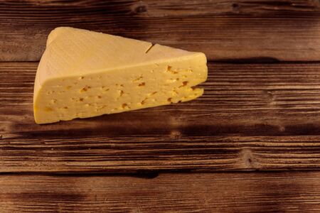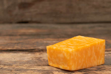 Piece of marble cheese on wooden background. Tasty slice of cheese and copy space. Healthy dairy product.