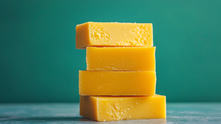 A stack of natural beeswax blocks set against a solid green background, representing organic materials, crafting, and natural products. The image is simple yet detailed, focusing on texture.