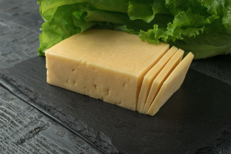 A sliced piece of cheese and lettuce leaves on a black wooden table. A natural product made from milk.