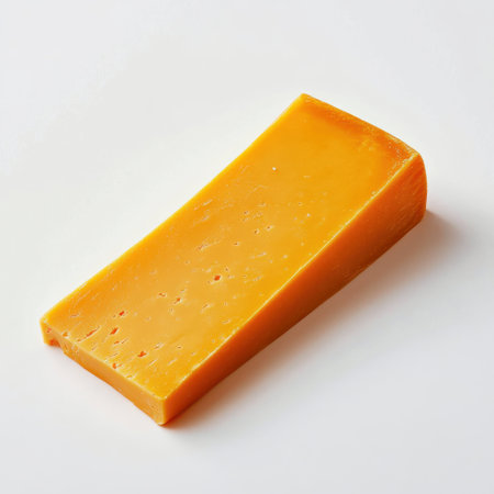 A bold slice of cheddar cheese rests on a clean white surface, highlighting its rich orange hue and smooth surface. Perfect for sandwiches or cheese platters.
