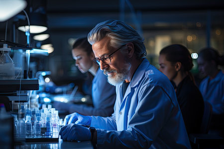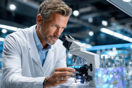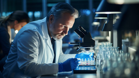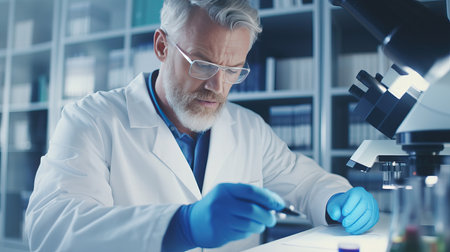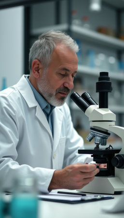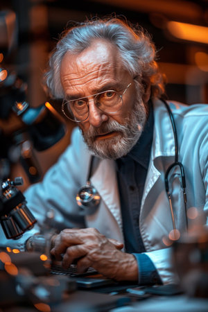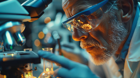 An experienced scientist uses a microscope to examine samples in a research lab, portraying wisdom, knowledge, and advanced scientific research in a modern, well-equipped laboratory setting.