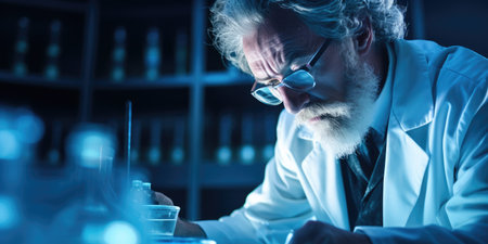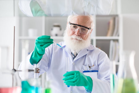 Elderly Caucasian male scientist conducting experiments in the laboratory. Concept Scientist, Elderly, Caucasian, Laboratory, Experiments