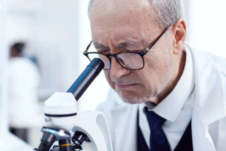 Senior man carrying out scientific investigation looking throug microscope. Chemist researcher in sterile lab doing experiments for medical industry using modern technology.