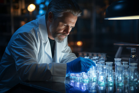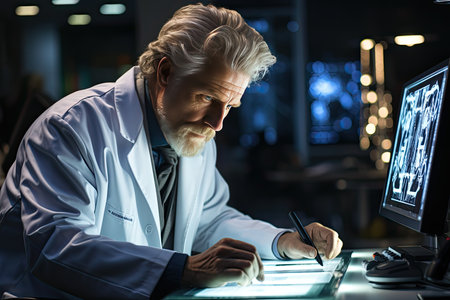 In this captivating image, a focused man dressed in a lab coat diligently conducts research in a modern laboratory. His passion for science and commitment to innovation is evident as he intricately analyzes data and experiments. This scene embodies the spirit of scientific inquiry and the pursuit of knowledge through experimentation.