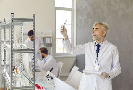 Serious senior male scientist working with chemical samples in a modern science lab. Man in a medical gown carefully examines a test tube with a clear liquid that he holds in his hands.