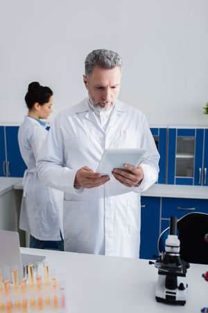 middle aged scientist looking at digital tablet while working near colleague in lab