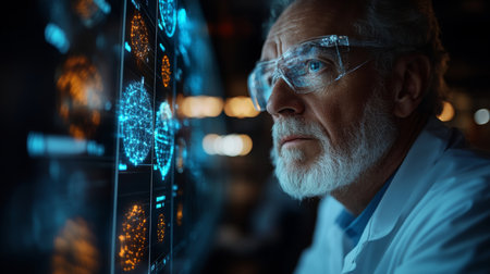 Futuristic doctor analyzing data on holographic screen in high tech medical facility at night