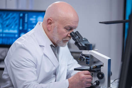 Serious mature scientist working with microscope in lab. Science, chemistry, biology, medicine and people concept