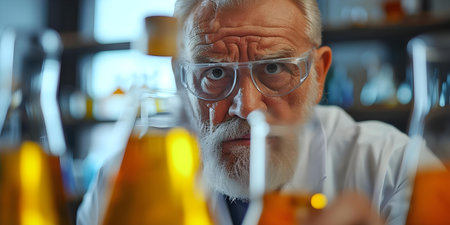 So serious. Attentive mature scientist wearing protective glasses while doing chemical experiment