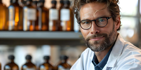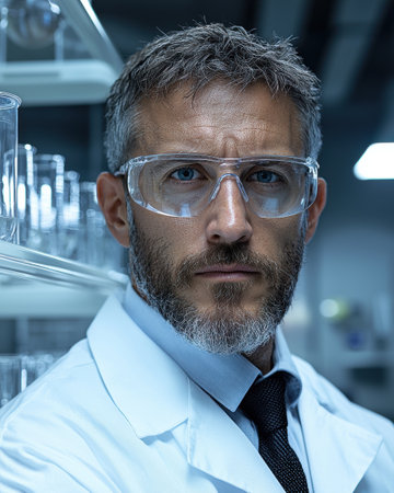 A focused man in a lab coat and glasses gazes confidently at the camera, embodying scientific expertise and professionalism in a laboratory setting.